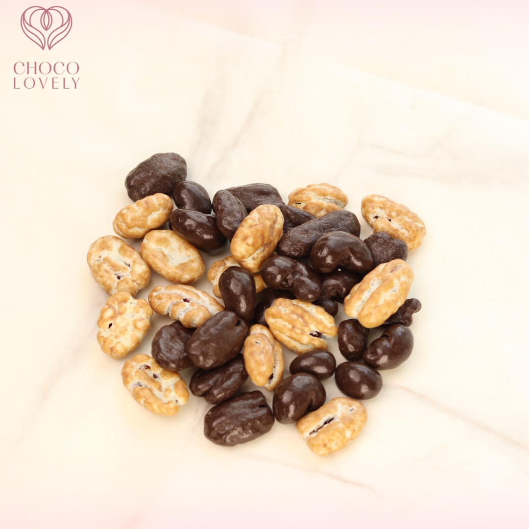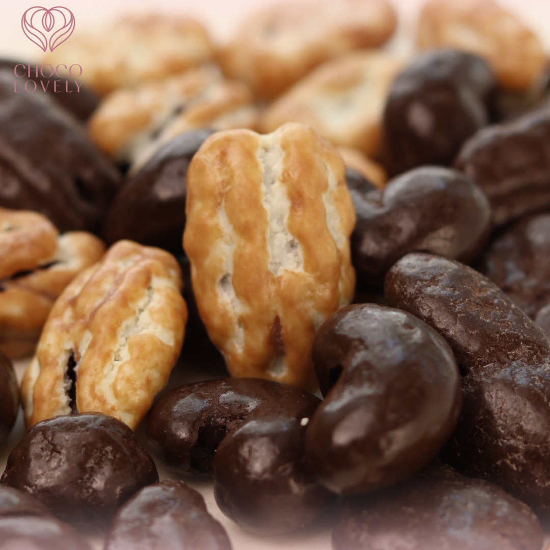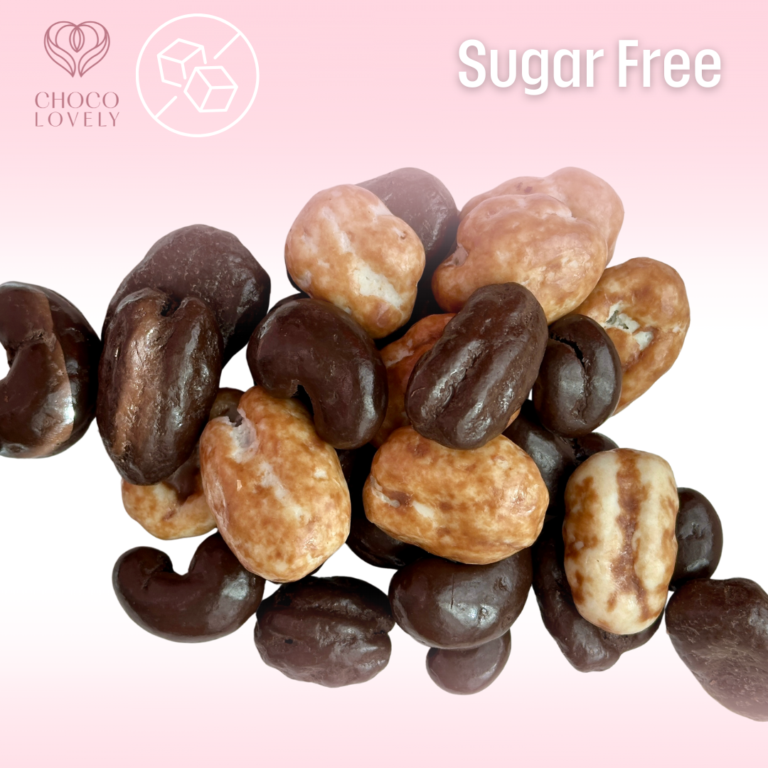 Milk, dark, and caramel sugar-free chocolates with pecans, almonds, and hazelnuts. Gluten-free and guilt-free.